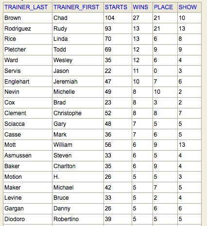 Update after today: another start, another win for a bump to 52.3%... top 20 trainers by wins so far at Belmont (thanks to Handycapper!)