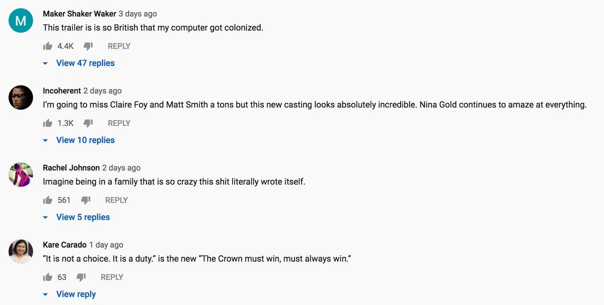 Youtube will always be my favorite place to read comments, this from the trailer for The Crown season 3