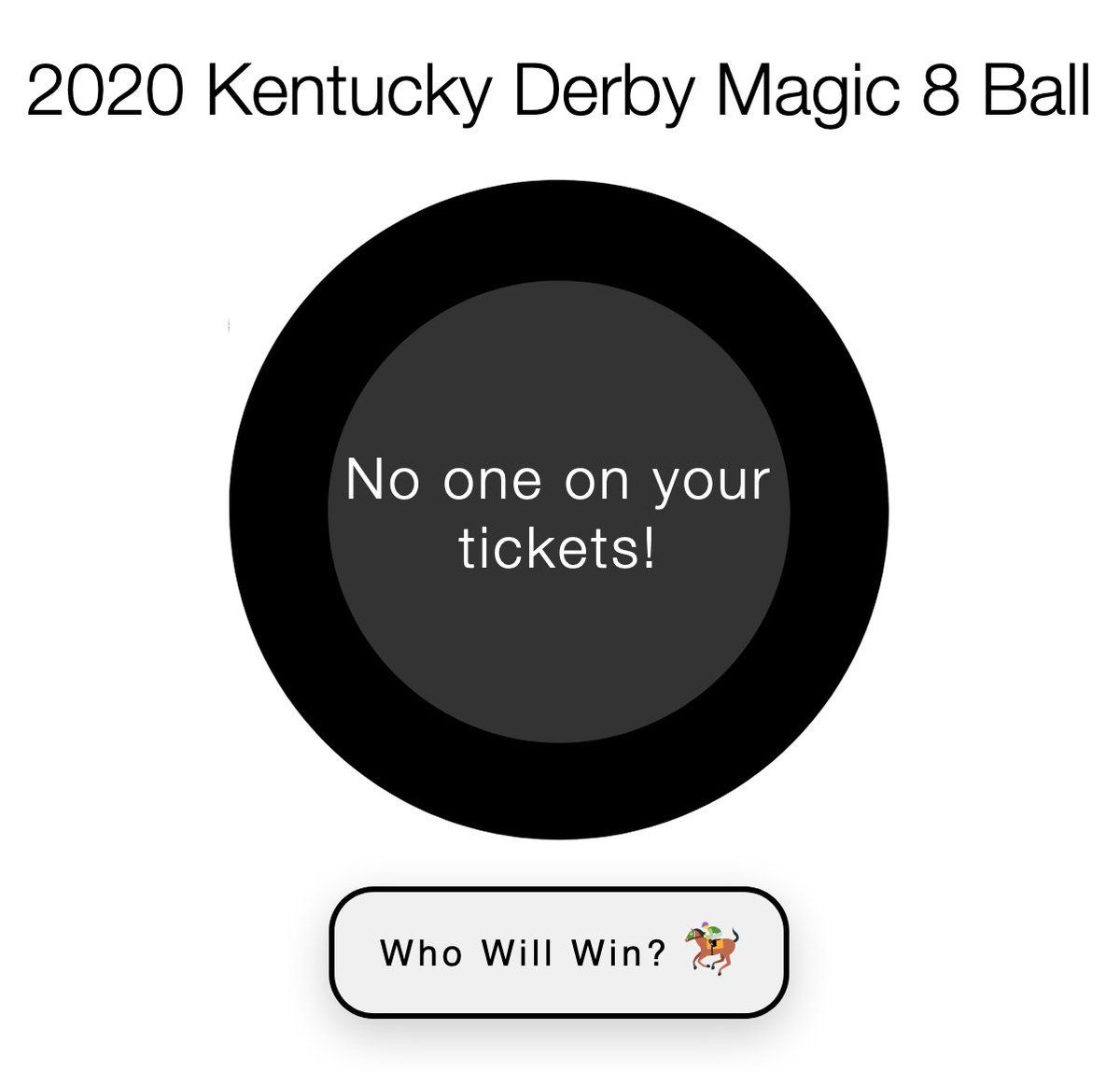 I'm standing with Louisville protesters and not playing the Oaks or Derby card, but I made the annual Derby Magic 8 Ball a few weeks ago. This prediction is correct since I'll be playing Saratoga... 2020-derby-8ball.glitch.me/