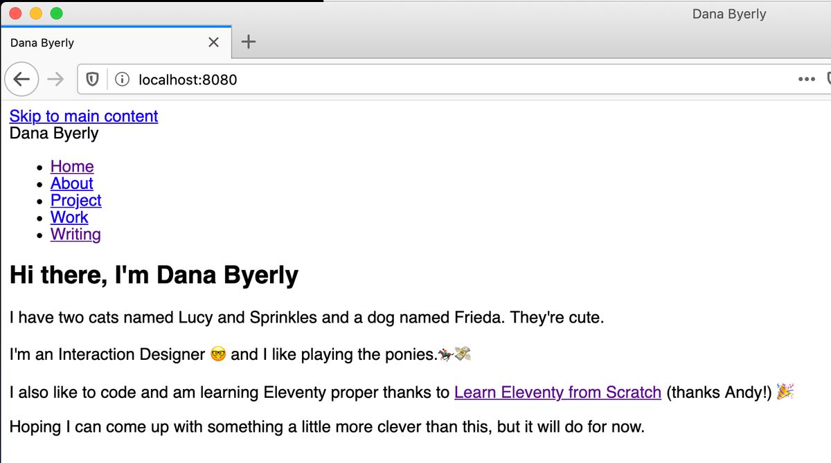Happy to report that I've finally got a site!🎉 Still plenty to do, but glad to have it out there, and could not have done without Eleventy from Scratch👍🏼 danabyerly.com/